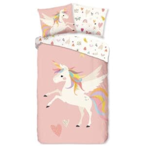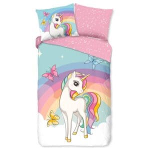 • Eenhoorn op regenboog en wolken kinderdekbedovertrekEenhoorn en regenboog dekbedovertrek in kinderkamer.