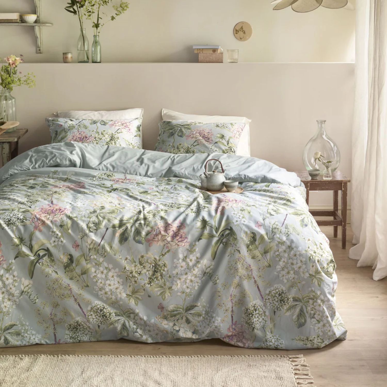 Geef jouw slaapkamer een romantische en sfeervolle uitstraling met het Ariadne at Home Corsage dekbedovertrek in groen. Het zachte groendessin is rijk gevuld met hortensia’s, veldbloemen en sierlijke bladeren, waardoor een dromerig en harmonieus geheel ontstaat. De verfijnde details zorgen voor een elegante look en brengen rust in de slaapkamer, perfect om iedere avond ontspannen in slaap te vallen.