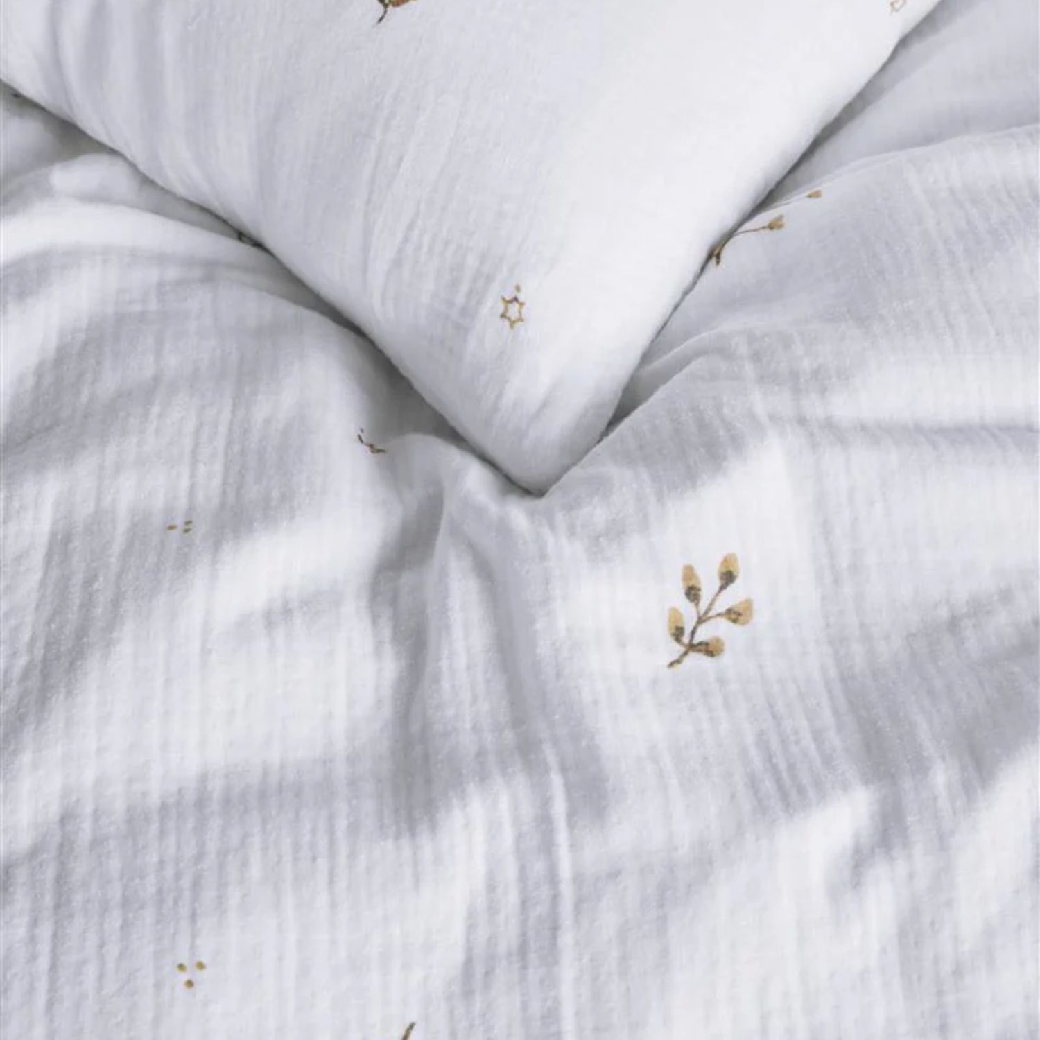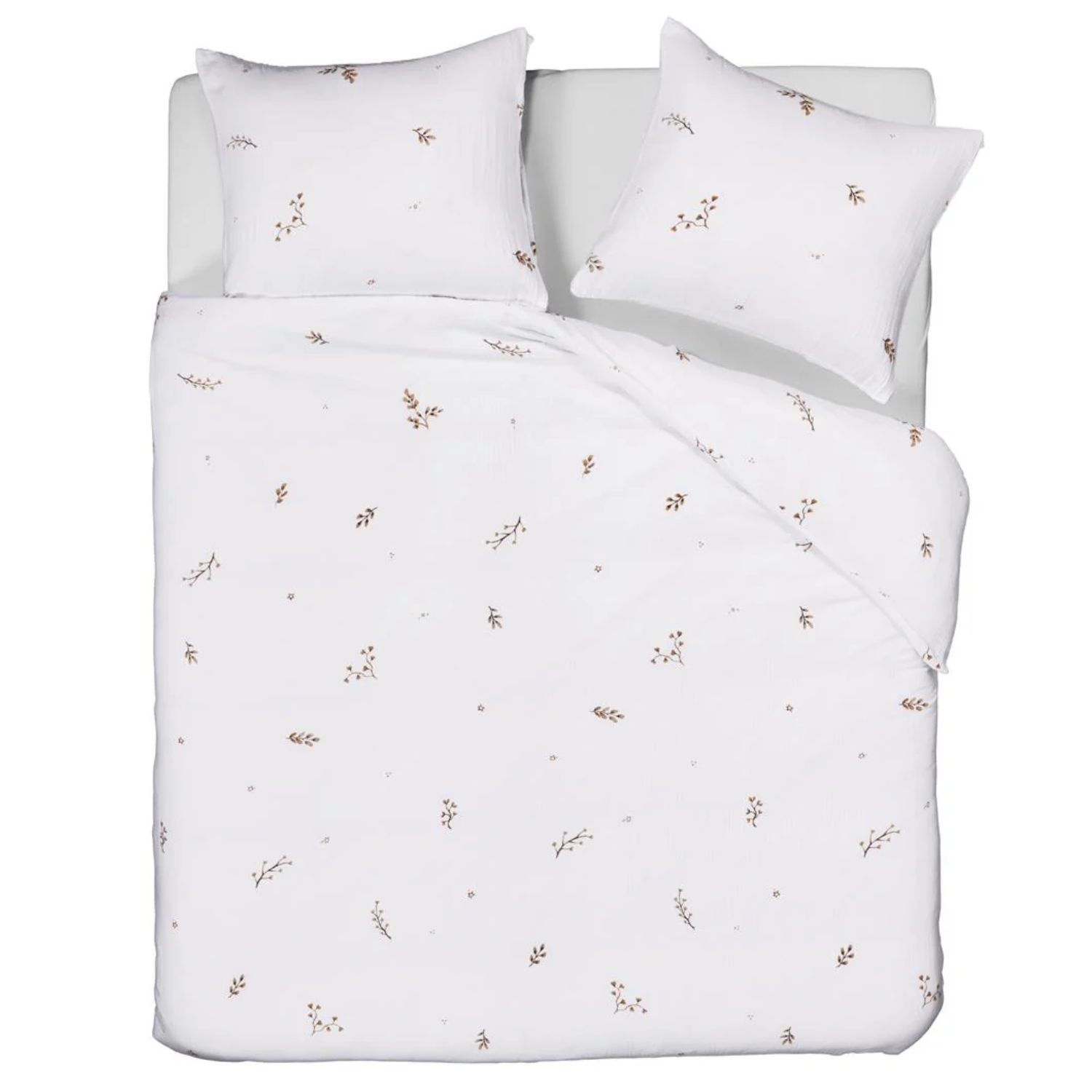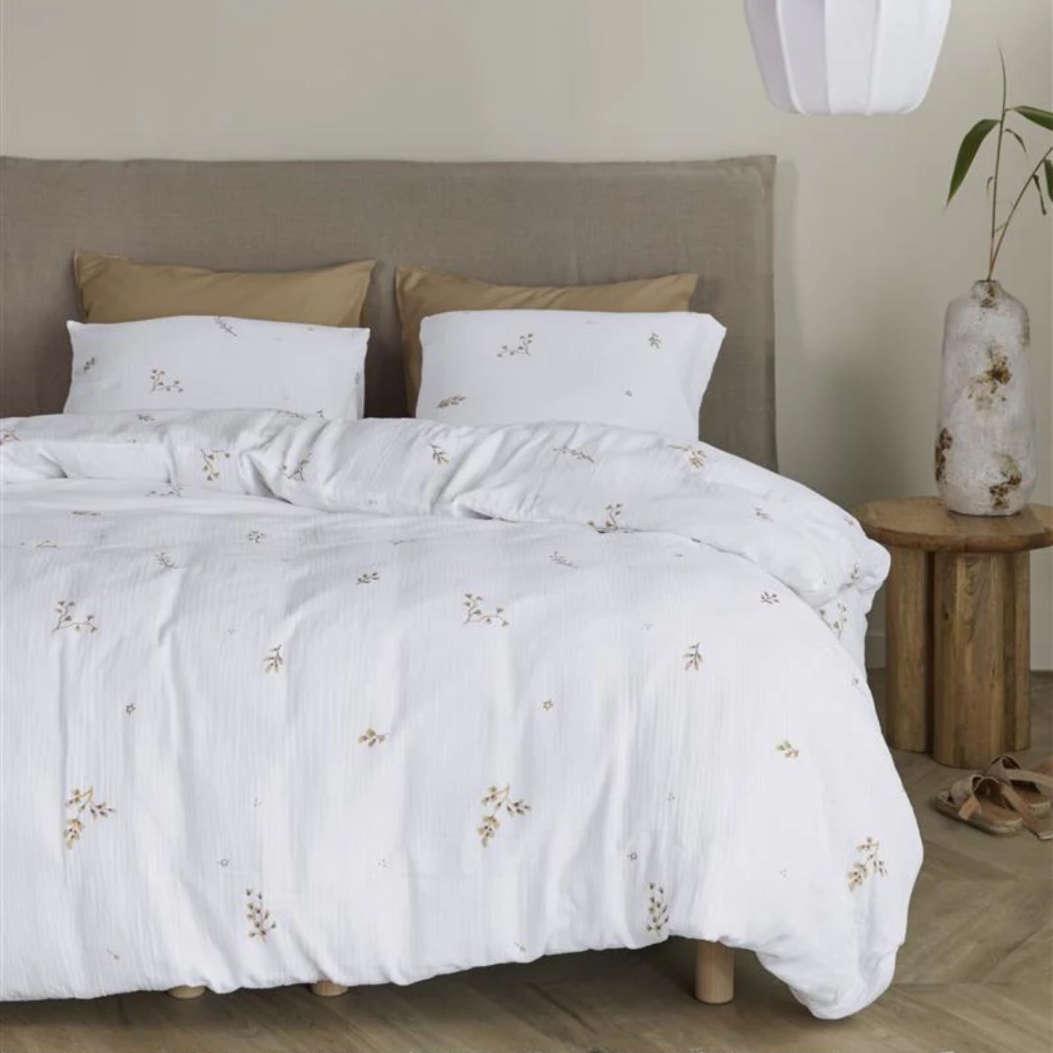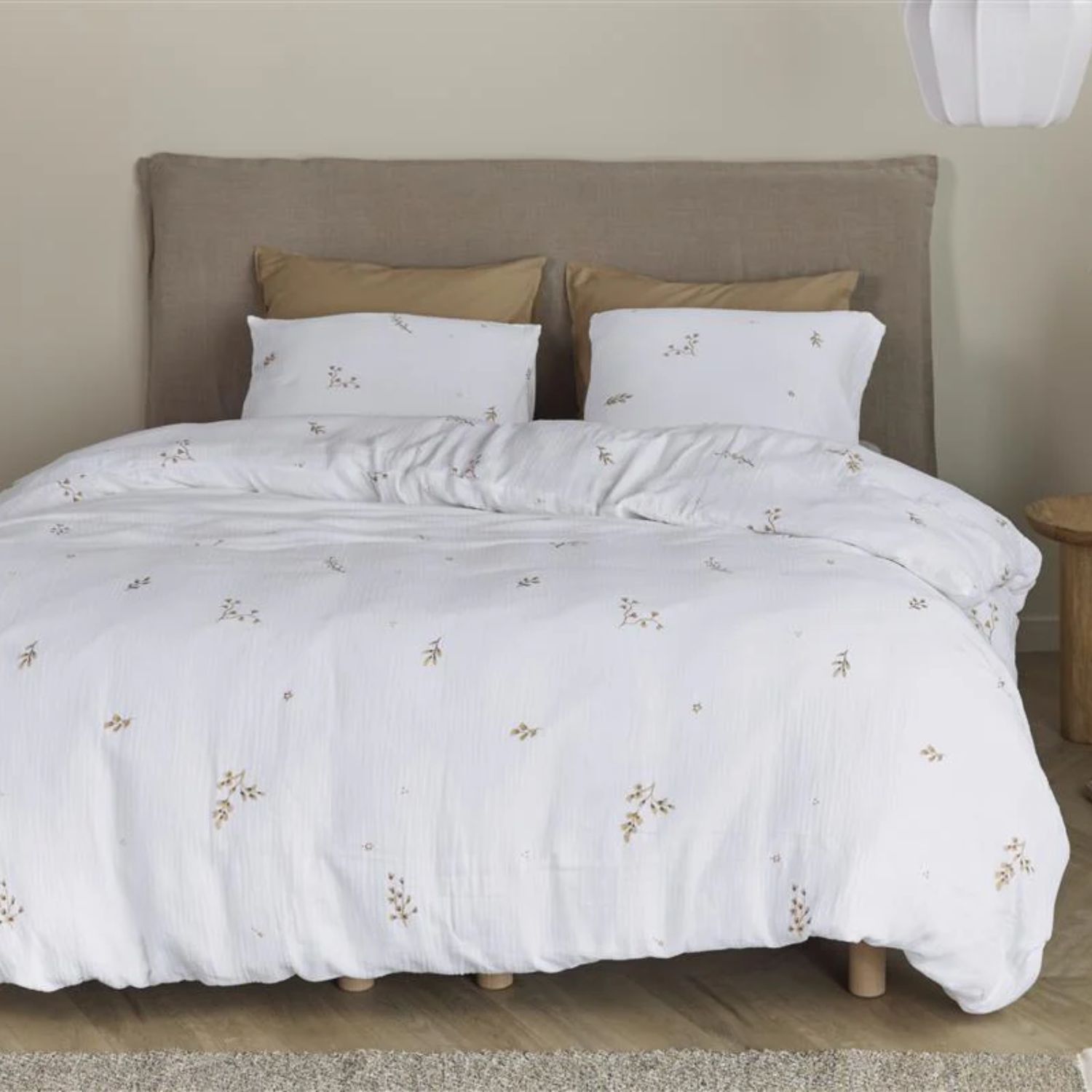 Het dekbedovertrek is vervaardigd uit 100% katoen mousseline. Deze superzachte, luchtige stof voelt heerlijk aaibaar aan en heeft een luxe, nonchalante uitstraling. Dankzij de kenmerkende structuur van mousseline is strijken niet nodig en komt het overtrek juist het mooist tot zijn recht wanneer het ongestreken op bed ligt. De ademende katoenkwaliteit zorgt bovendien voor een comfortabel slaapklimaat.