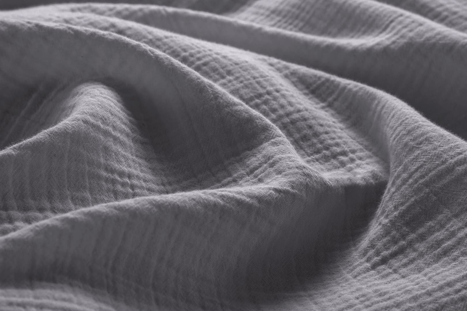 Mousseline, ook wel double gauze genoemd, is een unieke stof die bestaat uit twee fijne lagen los geweven katoen. Deze zijn op enkele punten subtiel met elkaar verbonden, waardoor een karakteristieke, natuurlijke kreukstructuur ontstaat – het bekende crinkle-effect.