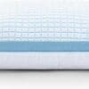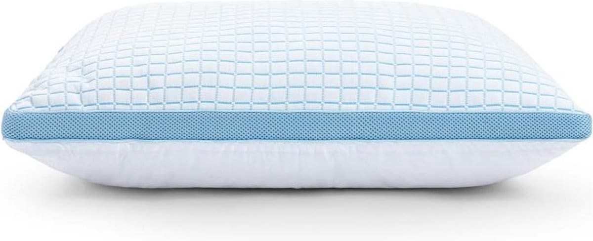 De bovenzijde is gemaakt van een ademende mix van 55% nylon en 45% polyester met verkoelende Blue Cell Tech, terwijl de onderzijde van 100% percale katoen zorgt voor een zacht en fris gevoel. Het luxe doorgestikte ontwerp, de blauwe bies en de 3D-ventilatieband maken dit kussen niet alleen functioneel, maar ook stijlvol.