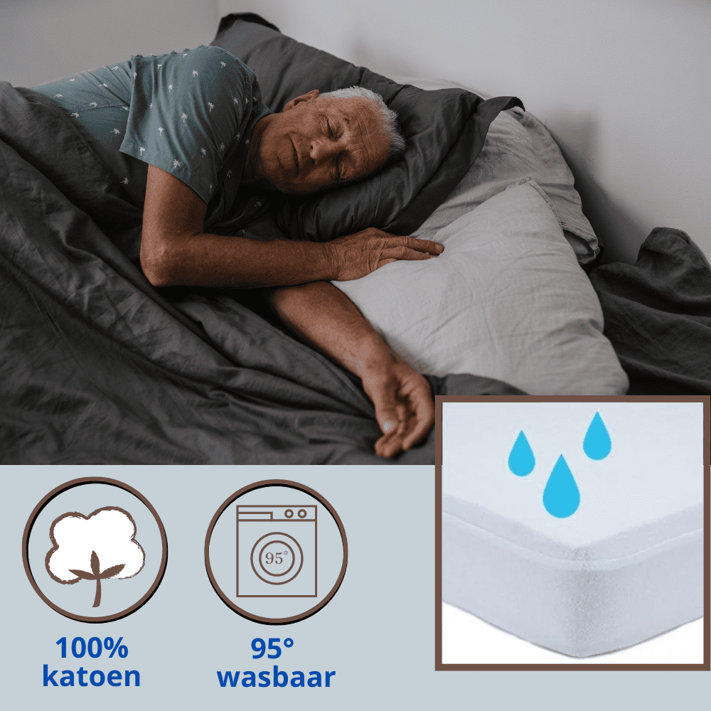 De bovenlaag van 100% katoen badstof voelt zacht aan en neemt vocht perfect op, terwijl de geruisloze PU-coating eronder 100% waterdicht is. Zo geniet je van een comfortabele, warme slaapbeleving zonder plastiek geluid of ongewenste nattigheid.