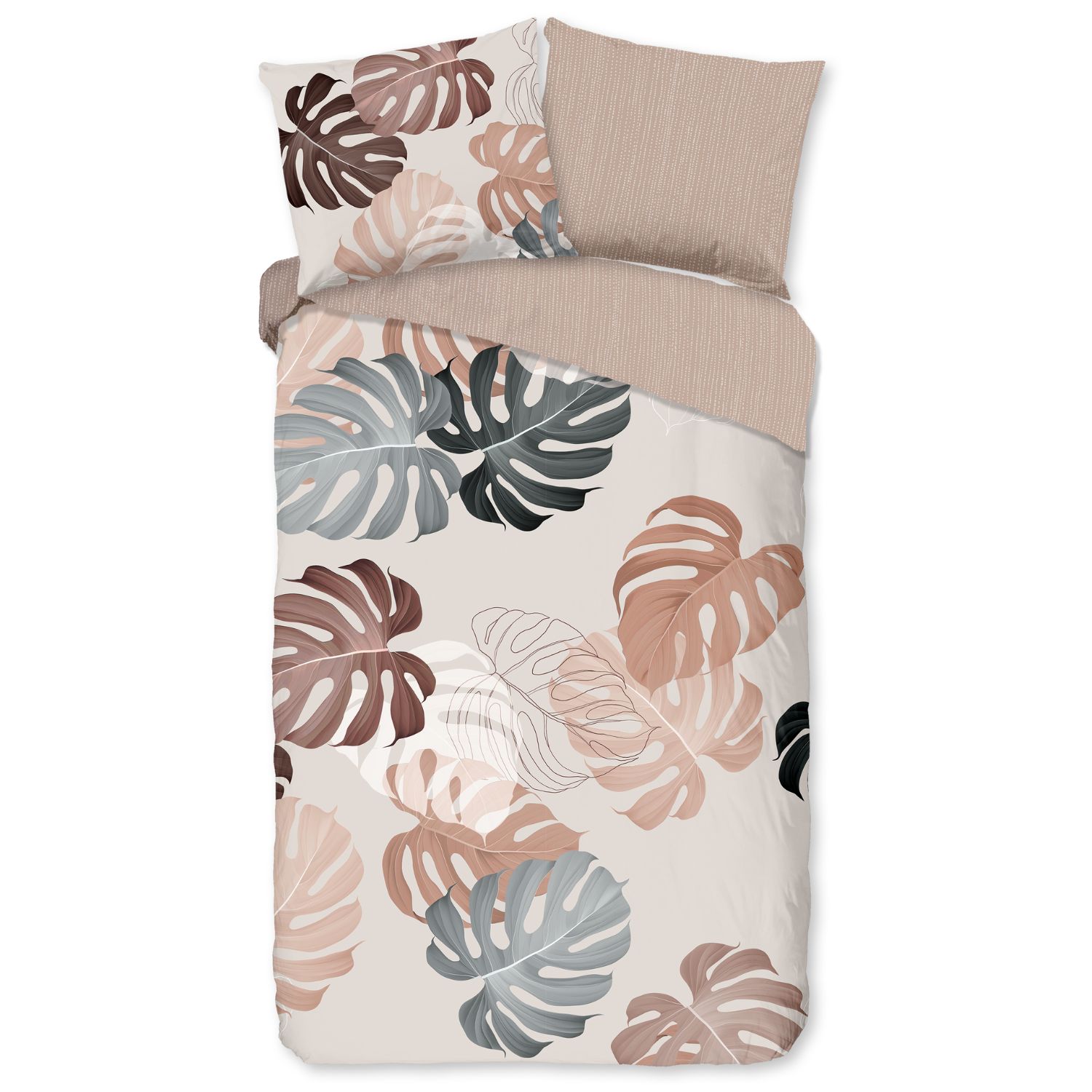 Breng rust en een natuurlijke sfeer in je slaapkamer met het Good Morning Cianna dekbedovertrek. Het overtrek is voorzien van een stijlvol dessin met grote bladeren van de gatenplant in een warme zandkleur. Dit botanische ontwerp zorgt voor een moderne en serene uitstraling en laat zich moeiteloos combineren met diverse interieurstijlen, van modern tot natuurlijk.