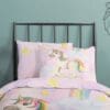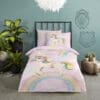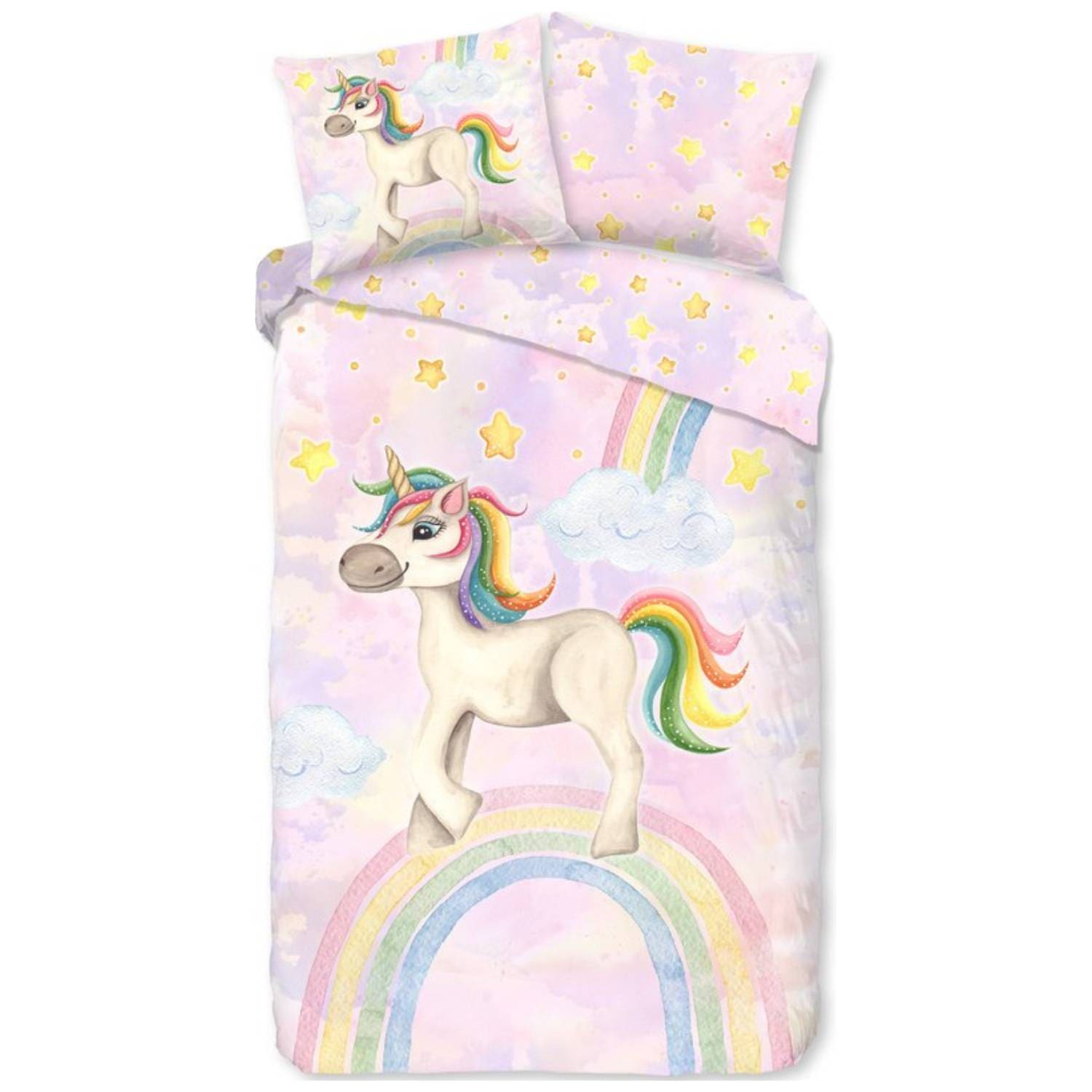 Iedere avond een avontuur in dromenland? Met het Unisweet kinderdekbedovertrek tover je de slaapkamer om in een fantasierijk paradijs. De vrolijke eenhoorn galoppeert onder de regenboog, terwijl zachte pastelkleuren rust en geborgenheid uitstralen. Dit design stimuleert de verbeelding en zorgt voor een glimlach op het gezicht van je kleintje.
