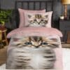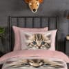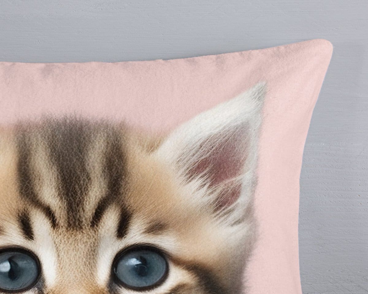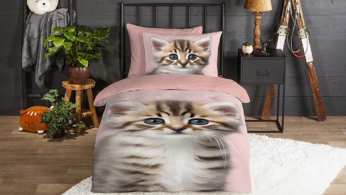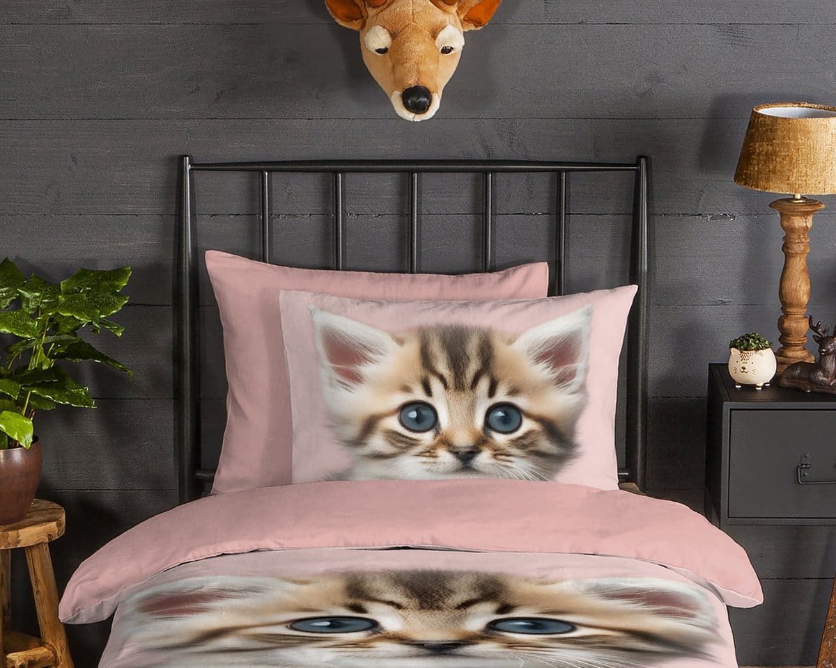De vrolijke print van een schattig kitten met grote ogen brengt een speelse en gezellige sfeer in elke kinderkamer. Het dekbedovertrek is voorzien van een dubbel doorlopende instopstrook en een bijpassende kussensloop. Dit product is Oeko-Tex gecertificeerd, dus veilig en huidvriendelijk.