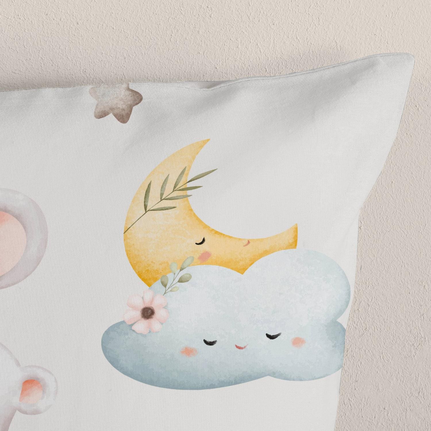 Met dit lieve ontwerp tover je de kinderkamer om tot een knusse, veilige plek waar fantasie en geborgenheid centraal staan. De omkeerbare kussensloop maakt het extra speels: de ene kant toont een detail uit het dessin, de andere kant is bezaaid met vrolijke hartjes in zachte tinten. Ideaal voor kleine kinderen die houden van knuffeldieren, sprookjesachtige wolken en een zonnetje dat altijd lacht.