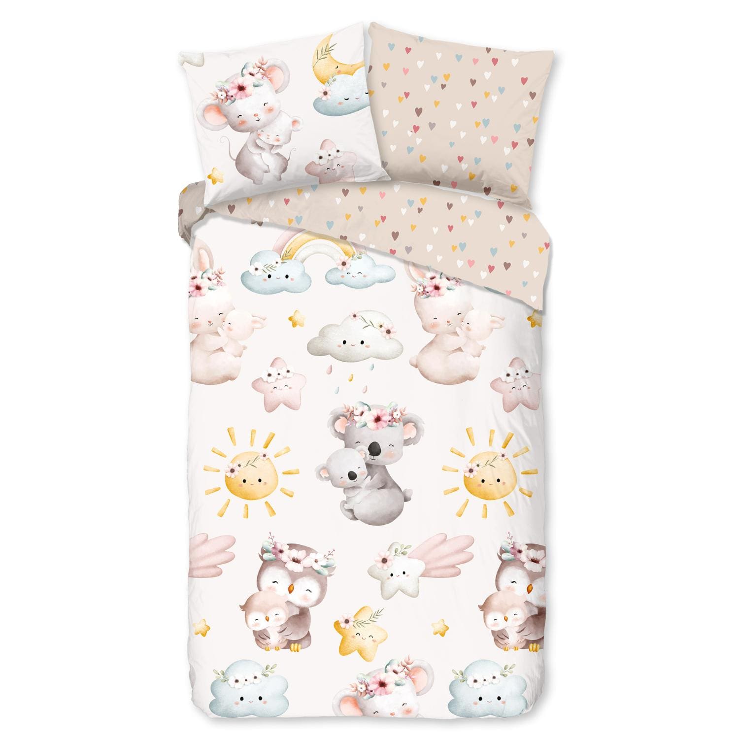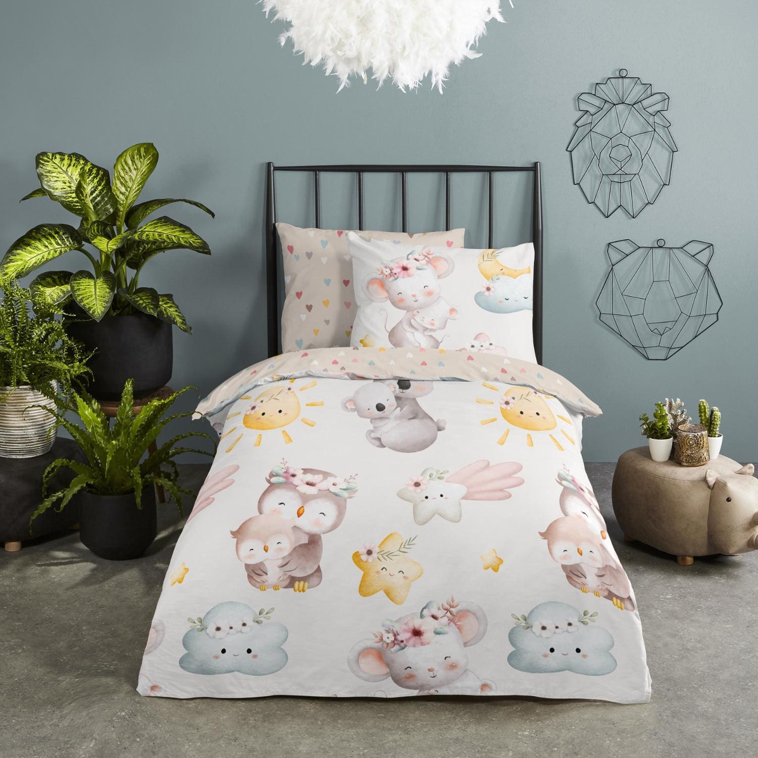 Laat je kindje heerlijk wegdromen onder dit superzachte kinderdekbedovertrek van Good Morning met een betoverende print van schattige dieren, wolkjes, sterretjes en zonnetjes. De zachte pastelkleuren en vrolijke figuurtjes zoals koala’s, uiltjes en konijntjes maken van elke nacht een magisch avontuur.