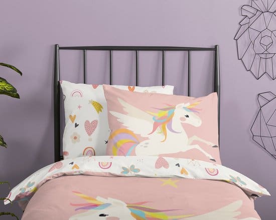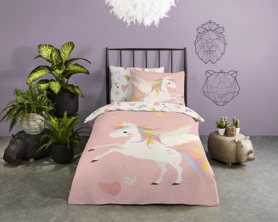 Kinderdekbedovertrek “Unicorn” van Good Morning met regenboog eenhoorn, in de kleur “Multi” is gemaakt van 100% katoen. Deze kwaliteit is ademend, vochtabsorberend en voelt zacht en soepel aan. Dit leuke kinderdekbedovertrek is een toevoeging aan iedere kinderkamer en is geschikt voor ieder jaargetijde. Het katoenen dekbedovertrek is heerlijk koel in de zomer en geeft warmte in de winter.