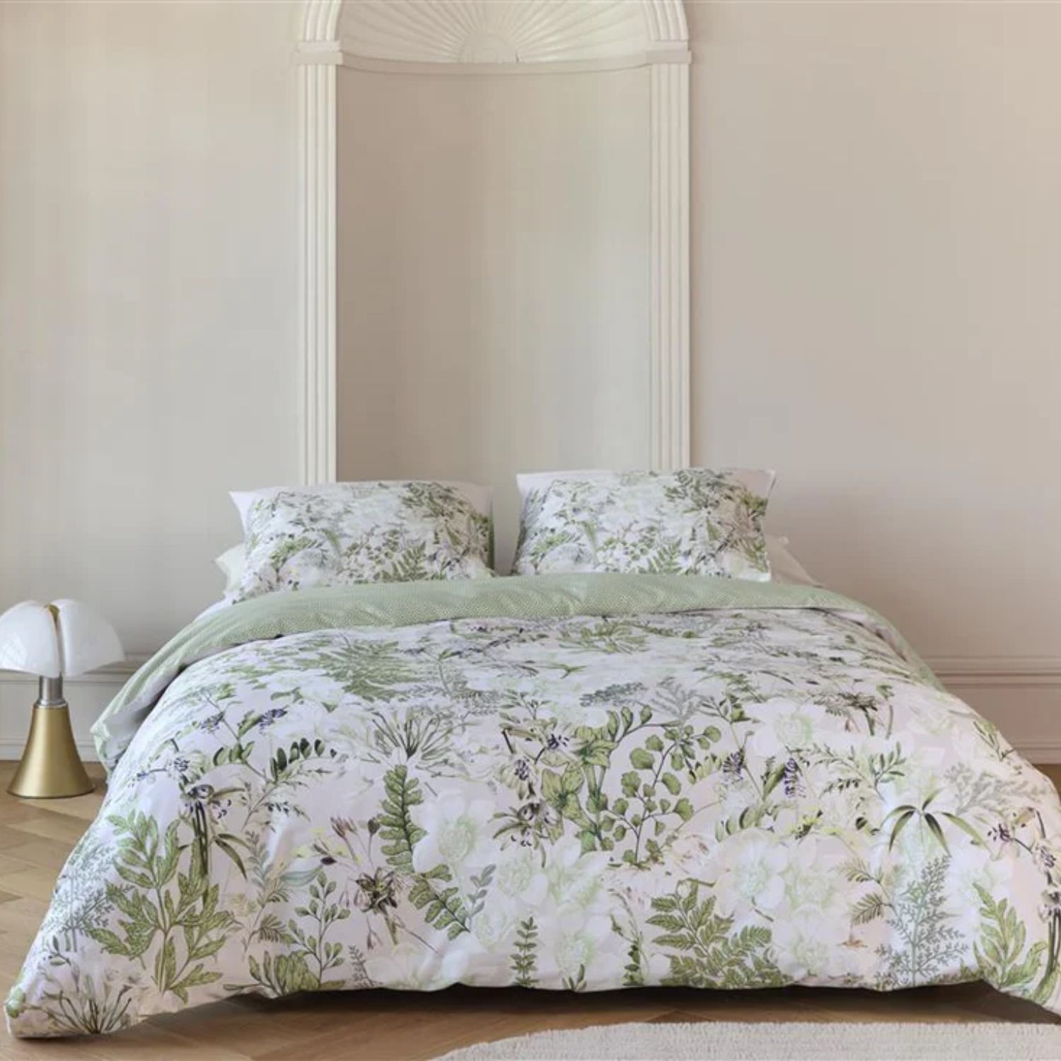 Het Kardol Pastiche dekbedovertrek is een luxe dubbelzijdig ontwerp dat je slaapkamer een verfijnde en stijlvolle uitstraling geeft. De voorzijde toont een rijke botanische print met takken en bloemen, terwijl de achterzijde is voorzien van een subtiel, verfijnd motief dat mooi aansluit op het bloemrijke dessin. Dankzij de lichte champagnekleurige basis, gecombineerd met vergrijsd groen en subtiel geel, creëert dit overtrek een frisse en elegante sfeer. De effen baan aan de bovenzijde zorgt voor een rustige afwerking – ideaal in combinatie met een gekleurd hoofdbord.