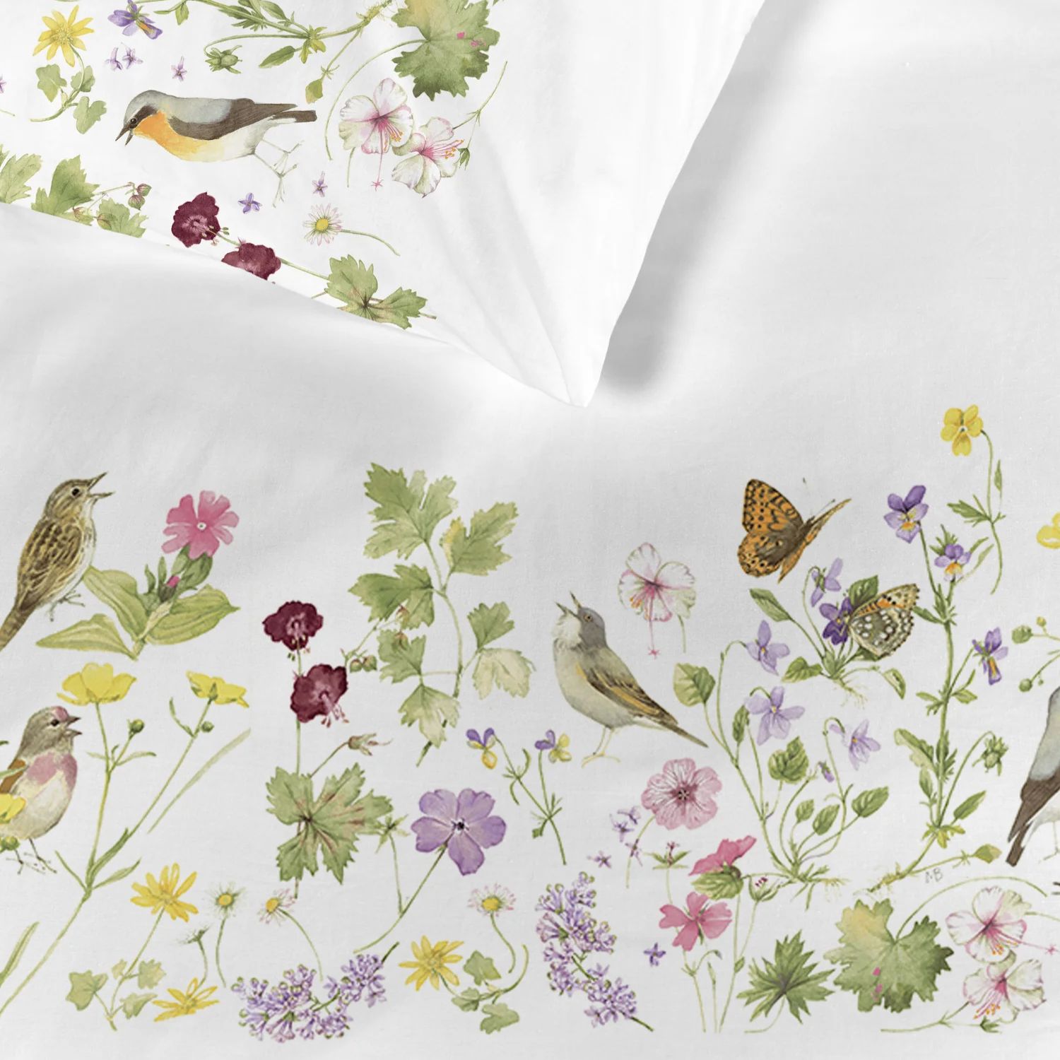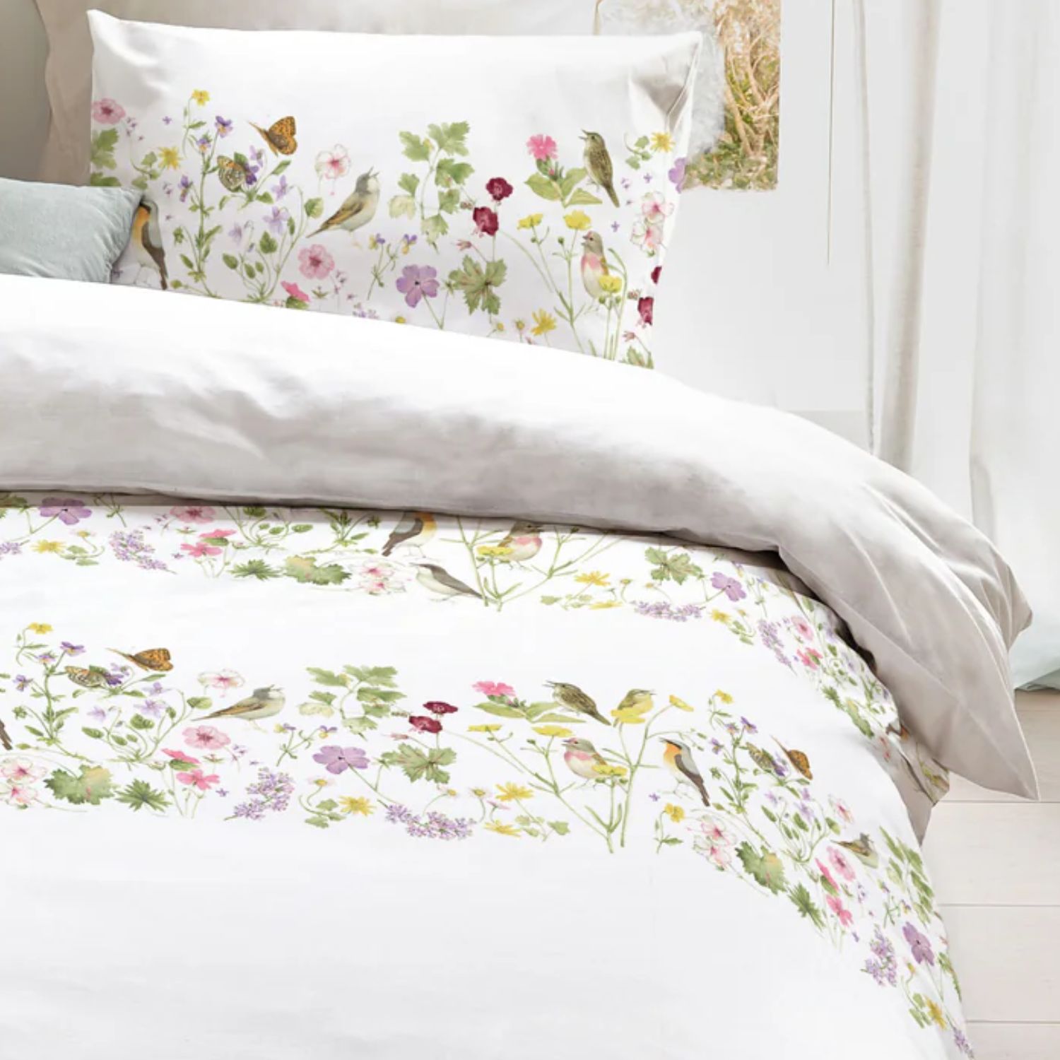 Breng het voorjaar in huis met het Marjolein Bastin Whispering Garden dekbedovertrek. Op het witte overtrek zijn bloemen en bladeren afgebeeld in twee sierlijke horizontale banen, met daartussen vogels en vlinders die zorgen voor een levendig en romantisch geheel. De zachte kleuren en verfijnde details creëren een frisse, natuurlijke sfeer waarin je iedere avond ontspannen in slaap valt.