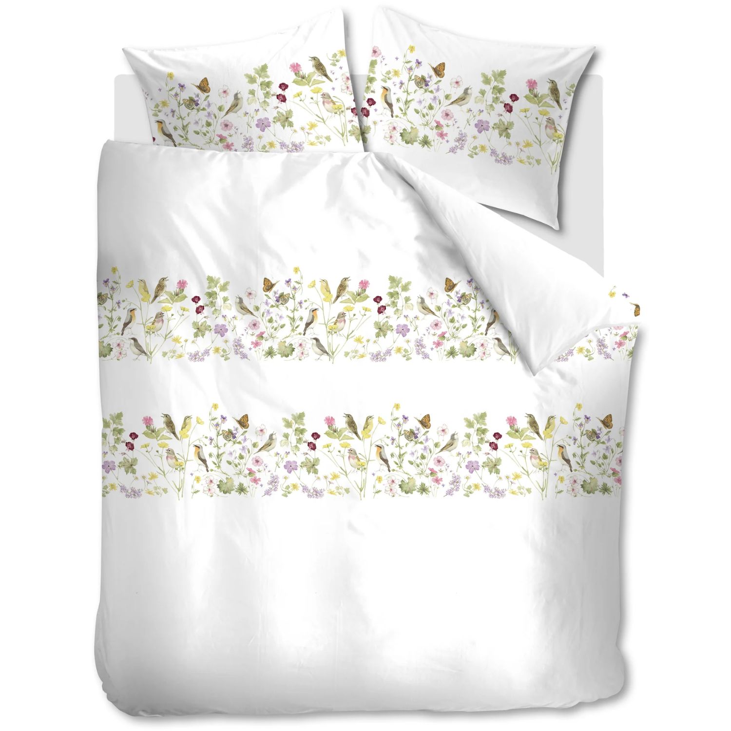 Breng het voorjaar in huis met het Marjolein Bastin Whispering Garden dekbedovertrek. Op het witte overtrek zijn bloemen en bladeren afgebeeld in twee sierlijke horizontale banen, met daartussen vogels en vlinders die zorgen voor een levendig en romantisch geheel. De zachte kleuren en verfijnde details creëren een frisse, natuurlijke sfeer waarin je iedere avond ontspannen in slaap valt.