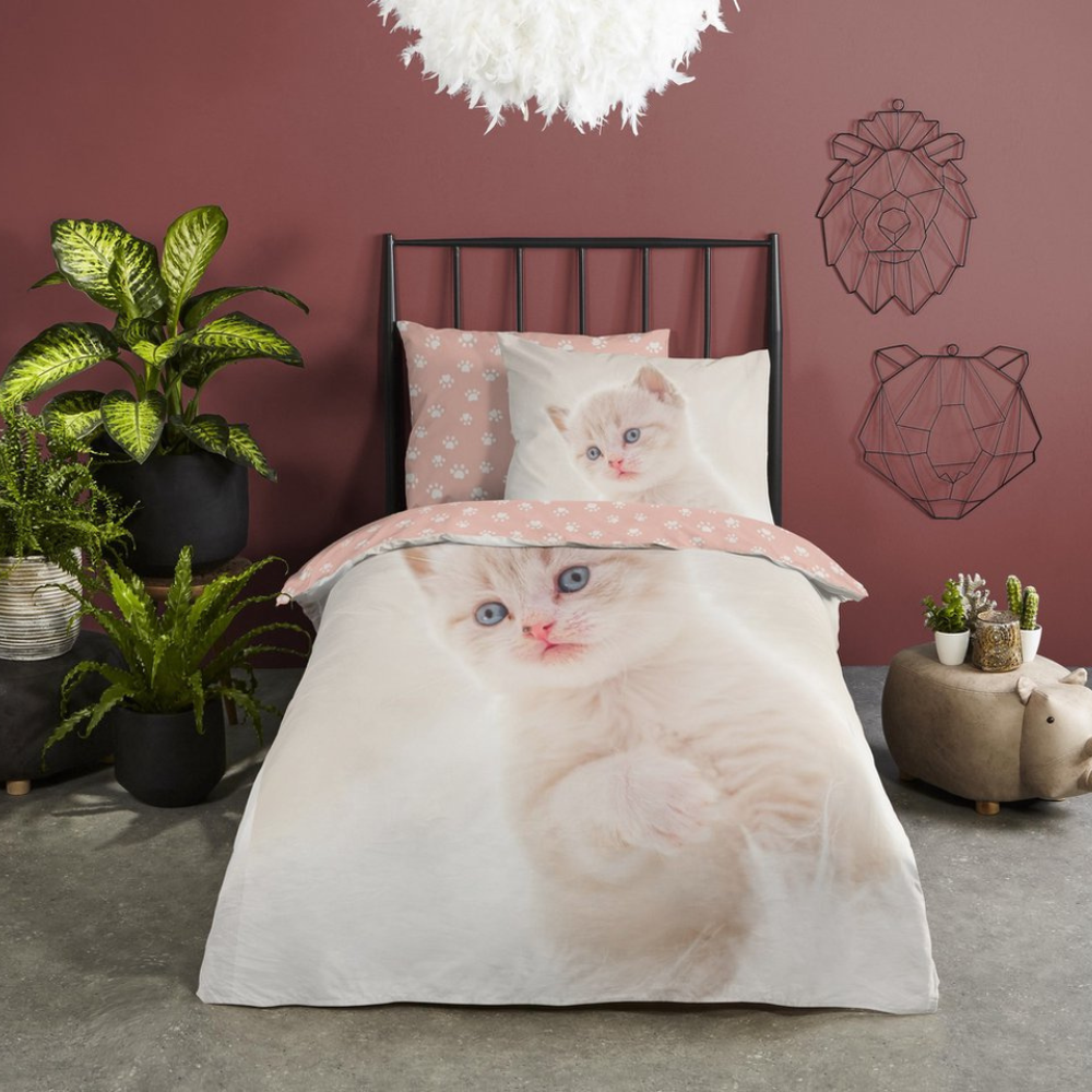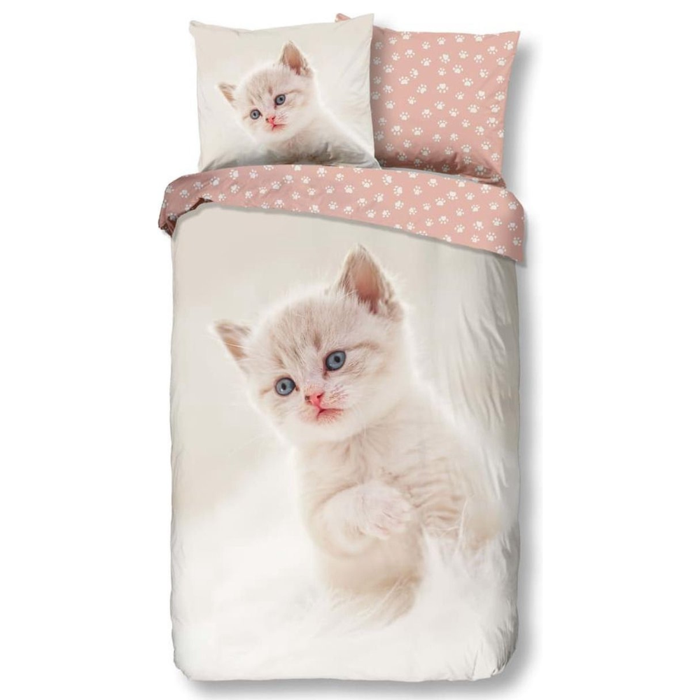 Gossie, wat een schatje is dit kleine poesje op het Droomtextiel Catty dekbedovertrek. Het witte pluizenbolletje zal vele harten stelen. Deze lieve print is natuurlijk erg leuk voor op de meidenkamer. Niet alleen de onmiskenbaar schattige foto, maar ook de zachte naturel tinten in combinatie met het zoete roze zijn prachtig om te zien. De achterzijde van het dekbedovertrek heeft een leuke all over print met witte kattenpootjes op een roze ondergrond.