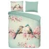 Het Descanso dekbedovertrek Minne is een ware blikvanger met zijn verfijnde print van twee sierlijke vogeltjes te midden van bloeiende kersenbloesem. De zachte mintgroene ondergrond straalt sereniteit uit en zorgt voor een frisse, natuurlijke sfeer in je slaapkamer. Perfect voor wie houdt van een rustige, elegante inrichting met een vleugje romantiek.
