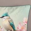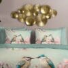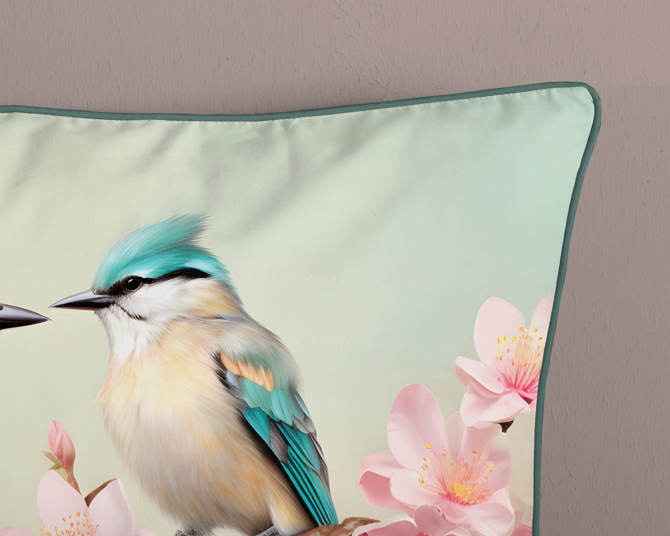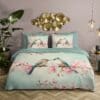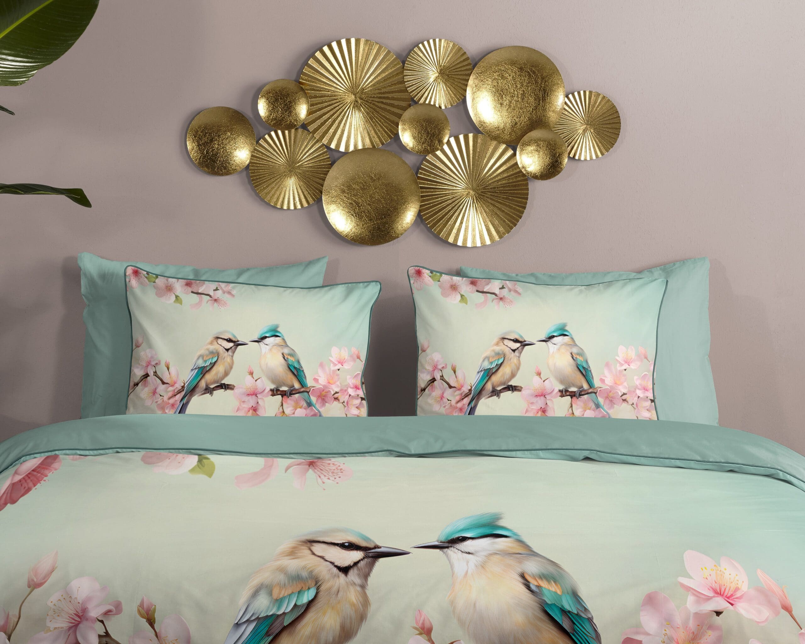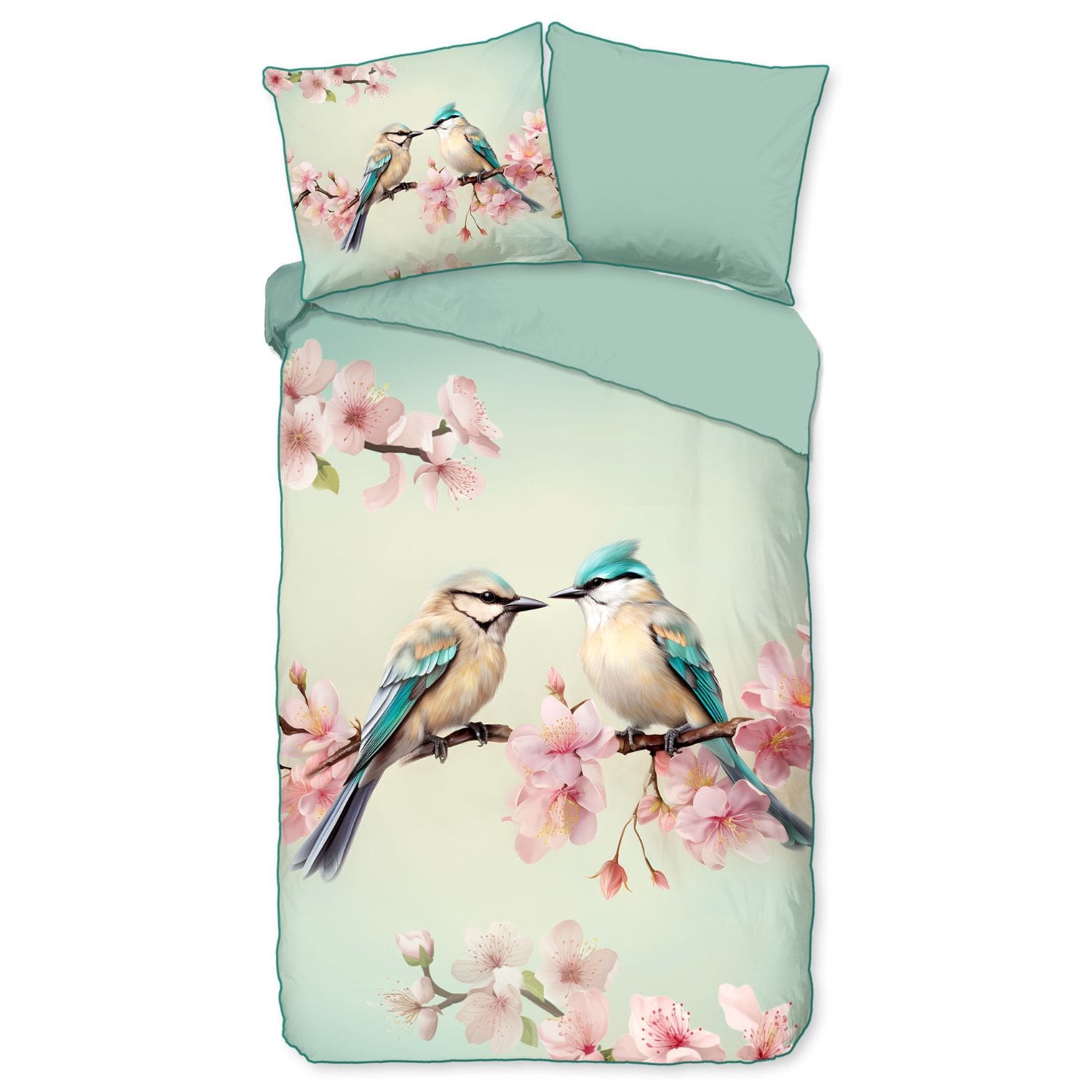 Het Descanso dekbedovertrek Minne is een ware blikvanger met zijn verfijnde print van twee sierlijke vogeltjes te midden van bloeiende kersenbloesem. De zachte mintgroene ondergrond straalt sereniteit uit en zorgt voor een frisse, natuurlijke sfeer in je slaapkamer. Perfect voor wie houdt van een rustige, elegante inrichting met een vleugje romantiek.