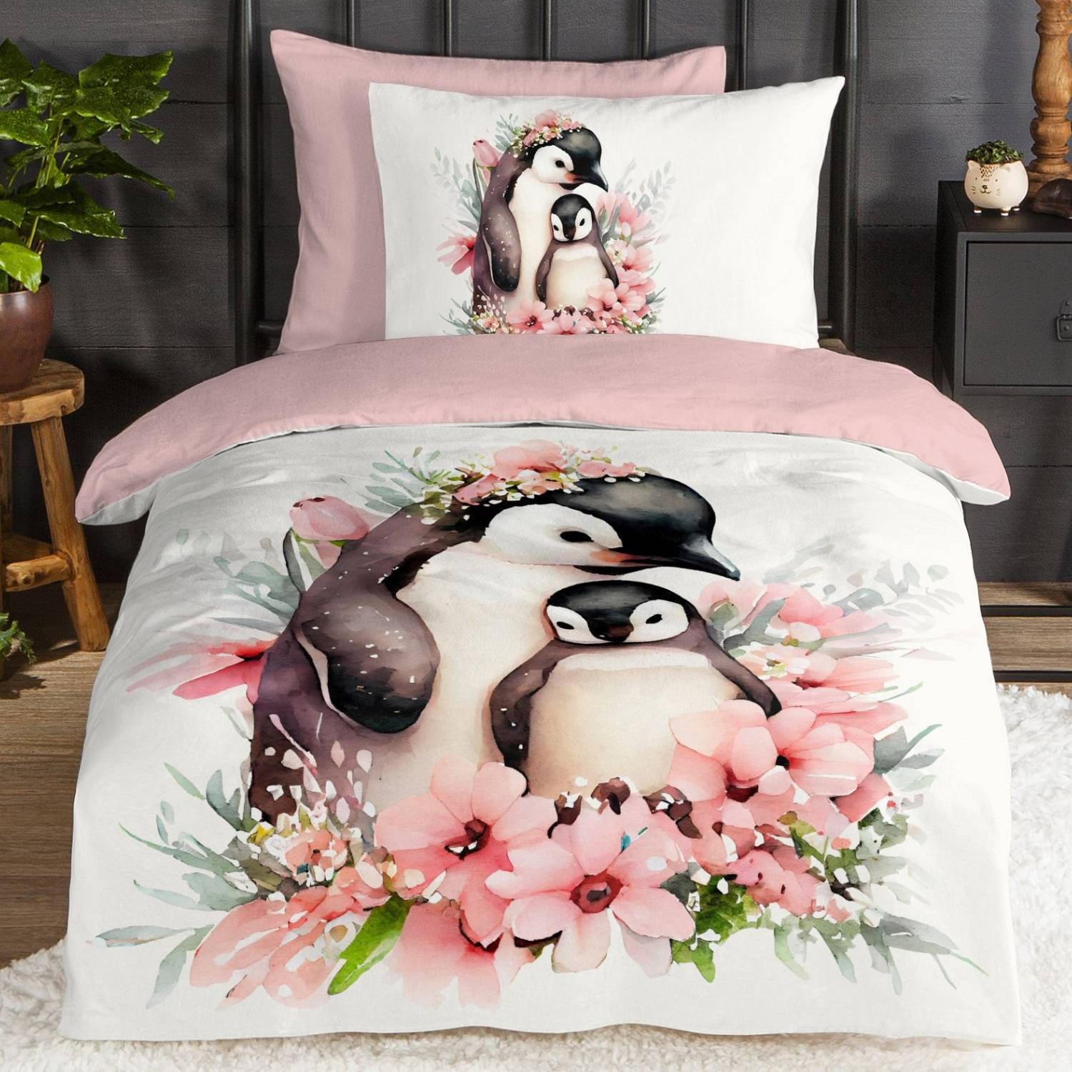 Het schattige ontwerp met een pinguïn en jong omringd door bloemen straalt warmte en liefde uit. Een perfect dekbedovertrek voor kinderen die dol zijn op dieren en een vrolijke, zachte uitstraling in hun slaapkamer willen.
