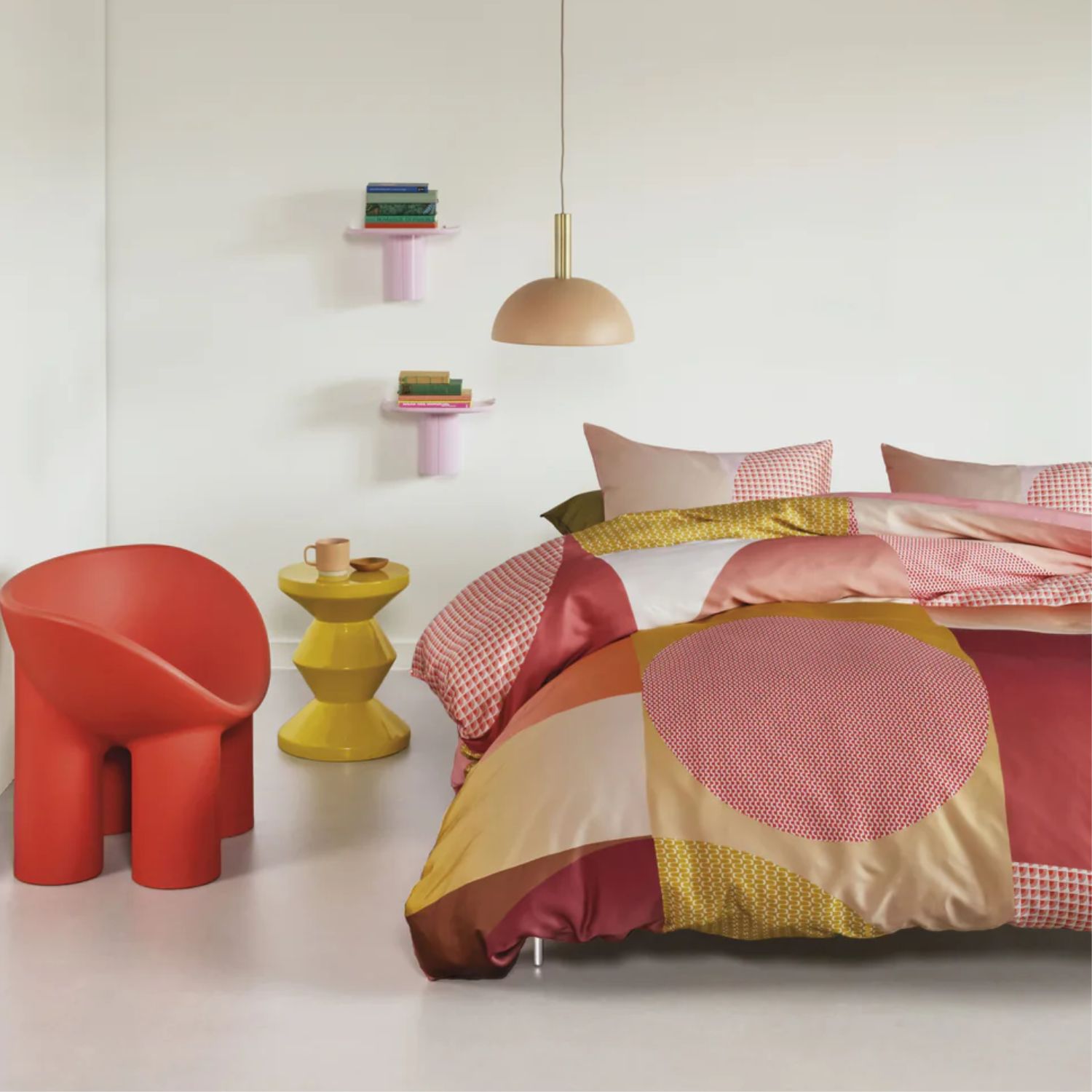 Breng kleur, warmte en kunstzinnige flair in je slaapkamer met het Beddinghouse Sunset Boulevard dekbedovertrek uit de Dutch Design collectie. Dit opvallende ontwerp is een echte eyecatcher dankzij de cirkels, geometrische vlakken en textuurpatronen die samen een dynamisch en harmonieus geheel vormen. De levendige koraaltinten gecombineerd met gouden accenten geven het dessin een luxueuze uitstraling en maken van jouw bed het stralende middelpunt van de kamer. De effen achterzijde maakt het mogelijk een stijlvolle omslag te creëren voor een extra verfijnde look. Het Sunset Boulevard dekbedovertrek is gemaakt van 70% lyocell (Tencel) en 30% katoen-satijn, een hoogwaardige en duurzame combinatie. Lyocell, afkomstig uit de eucalyptusboom, is van nature ademend, vochtabsorberend, antibacterieel en huidvriendelijk. In combinatie met katoen-satijn ontstaat een stof met een prachtige glans en een zijdezachte touch, voor een ultiem gevoel van comfort. Dankzij de dubbel doorlopende instopstrook blijft het dekbedovertrek netjes op zijn plaats, ook bij extra lange dekbedden. De totale lengte van circa 260 cm maakt het geschikt voor alle lengtematen.