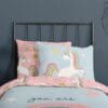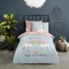 Dit betreft een 1 persoons kinderdekbedovertrek (140×200/220 cm + 1 kussensloop). Deze set bestaat uit 1 dekbedovertrek dat geschikt is voor dekbedden van 200 tot 220 cm lang en 1 kussensloop van 60×70 cm. Het dekbedovertrek heeft een dubbel doorlopende instopstrook van 20 cm en een totale lengte van circa 240 cm.