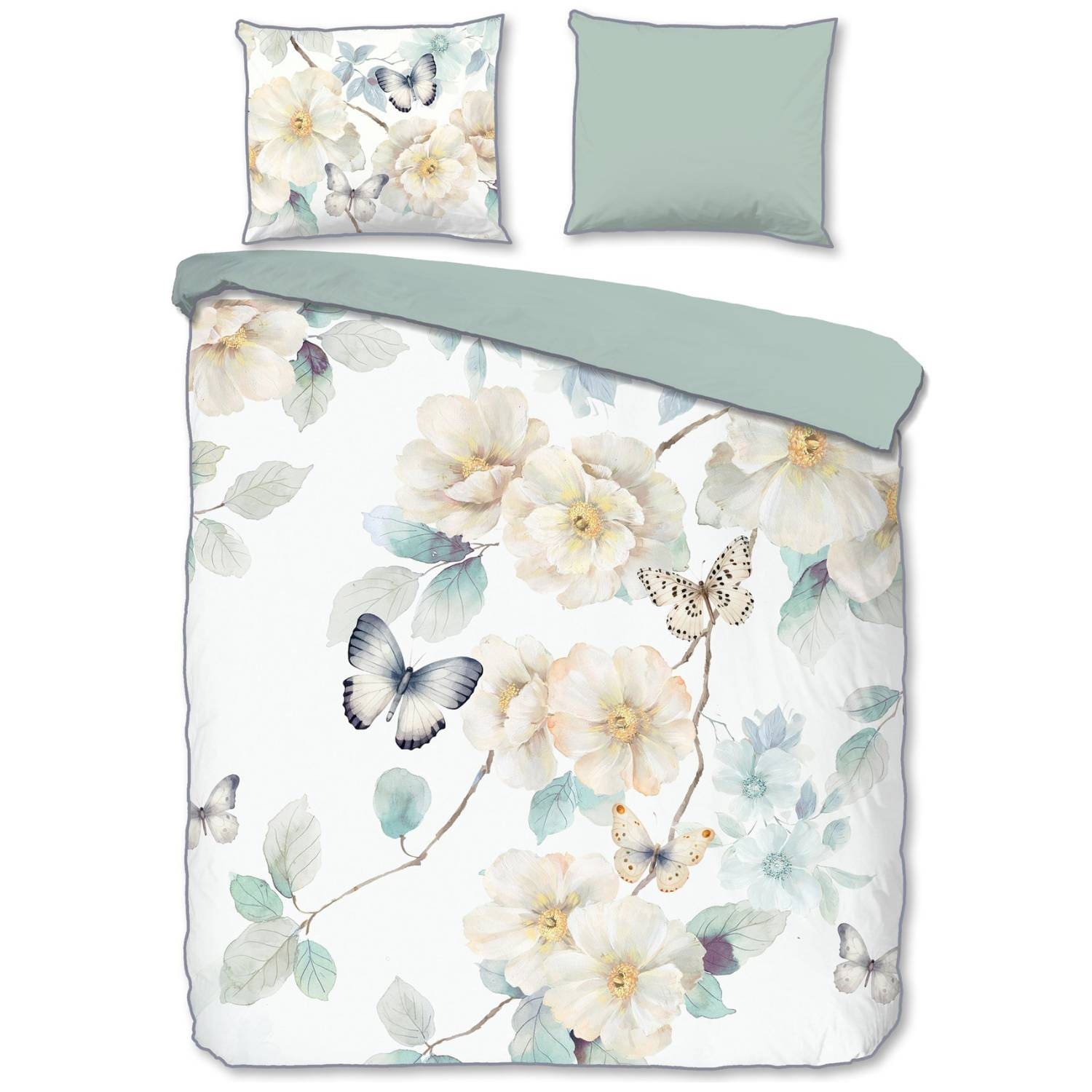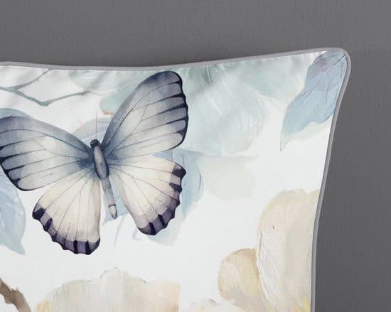 • Design: Adiwanya – wit met bloemen- en vlinderprint, uni achterzijde en bijpassende piping