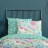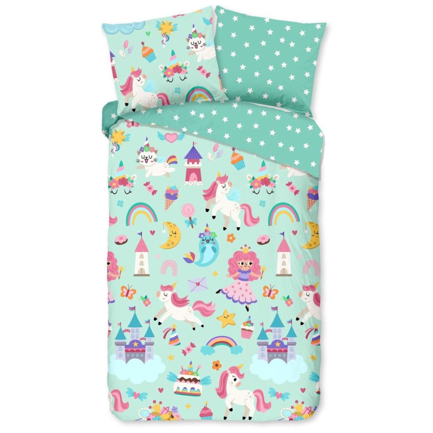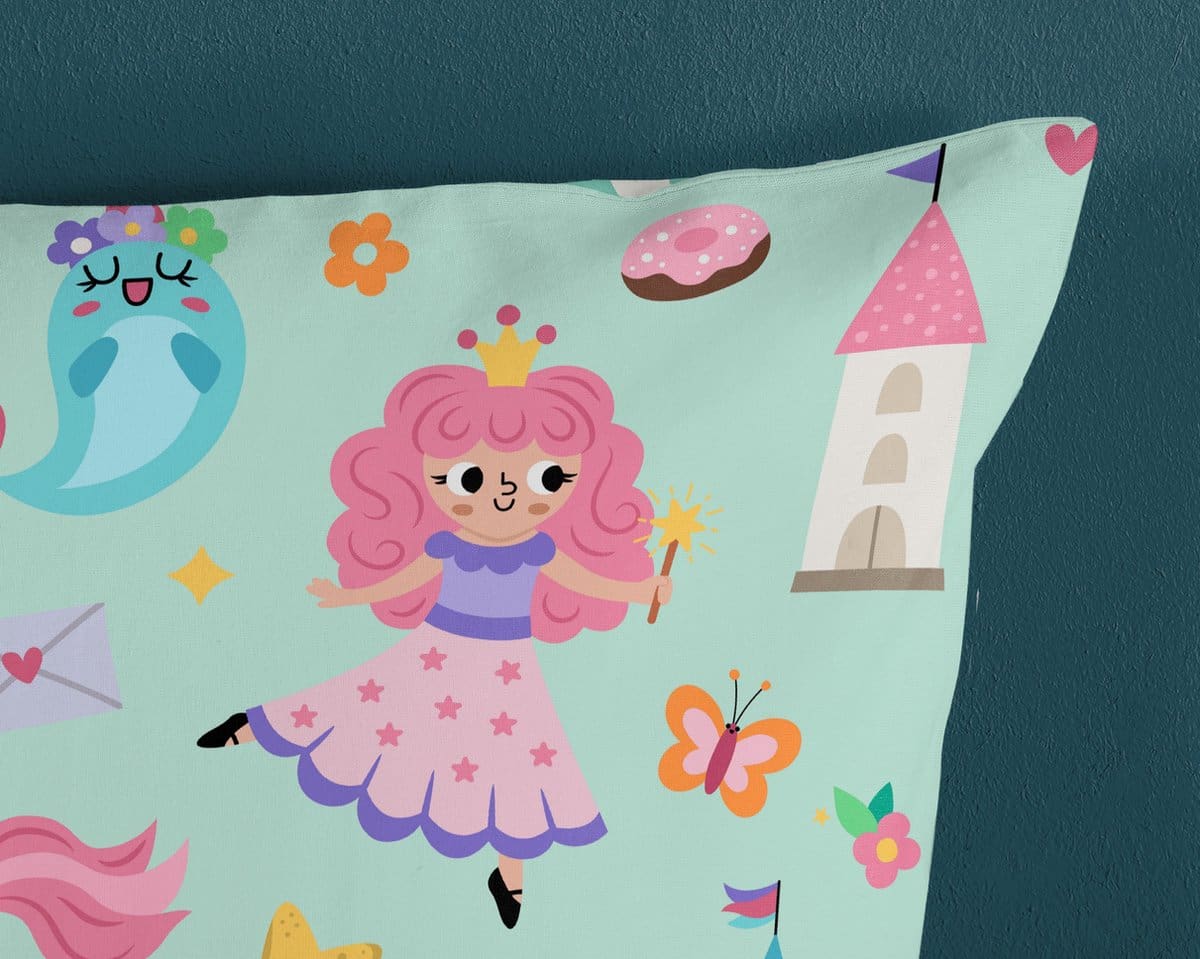 Kinderdekbedovertrek “Fantastic” van Good Morning met eenhoorn, prinses, regenboog, in de kleur “Mint” is gemaakt van 100% katoen. Deze kwaliteit is ademend, vochtabsorberend en voelt zacht en soepel aan. Dit leuke kinderdekbedovertrek is een toevoeging aan iedere kinderkamer en is geschikt voor ieder jaargetijde. Het katoenen dekbedovertrek is heerlijk koel in de zomer en geeft warmte in de winter.