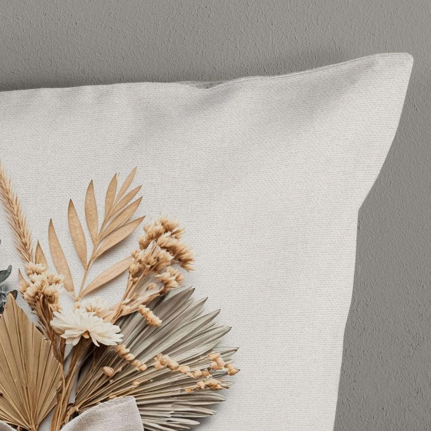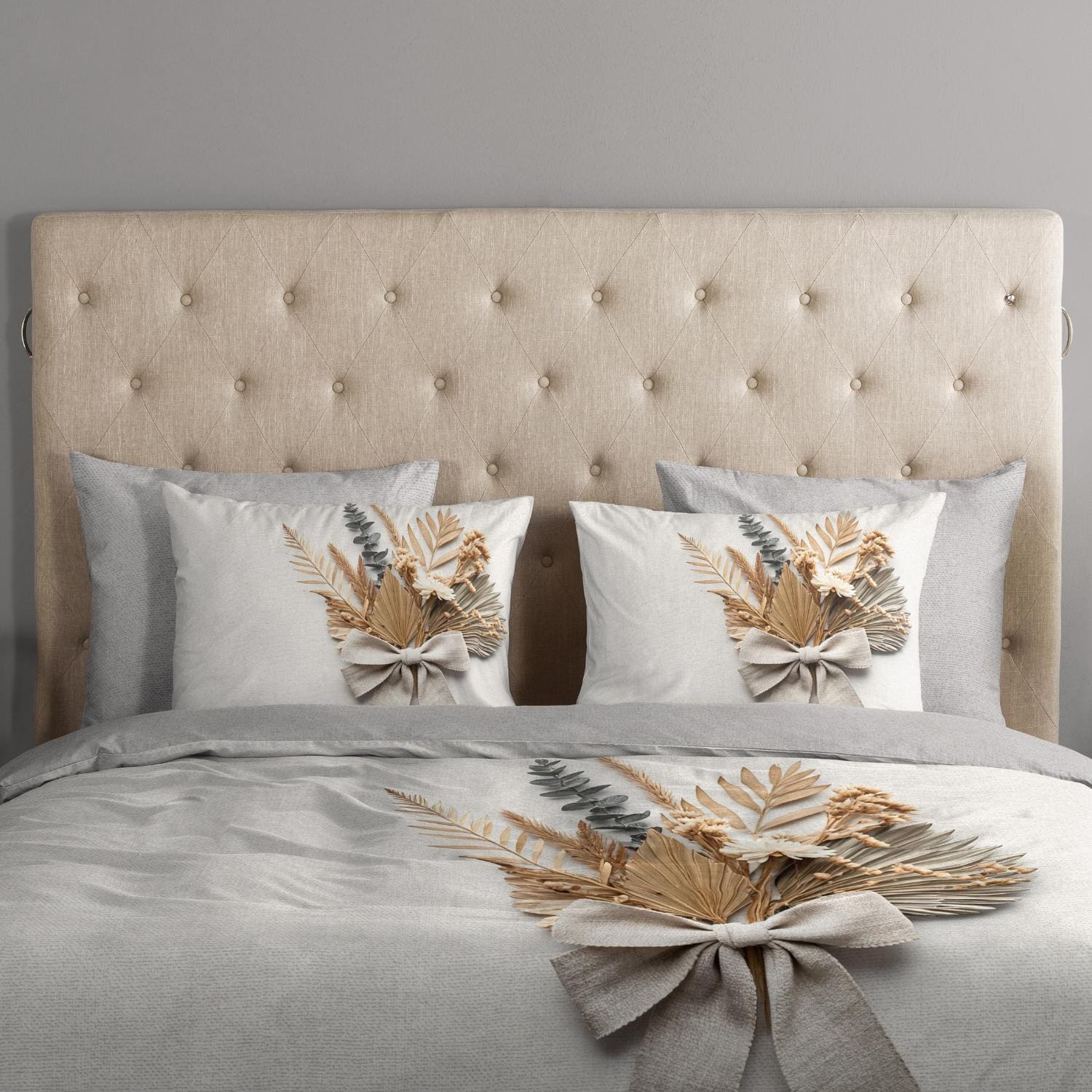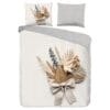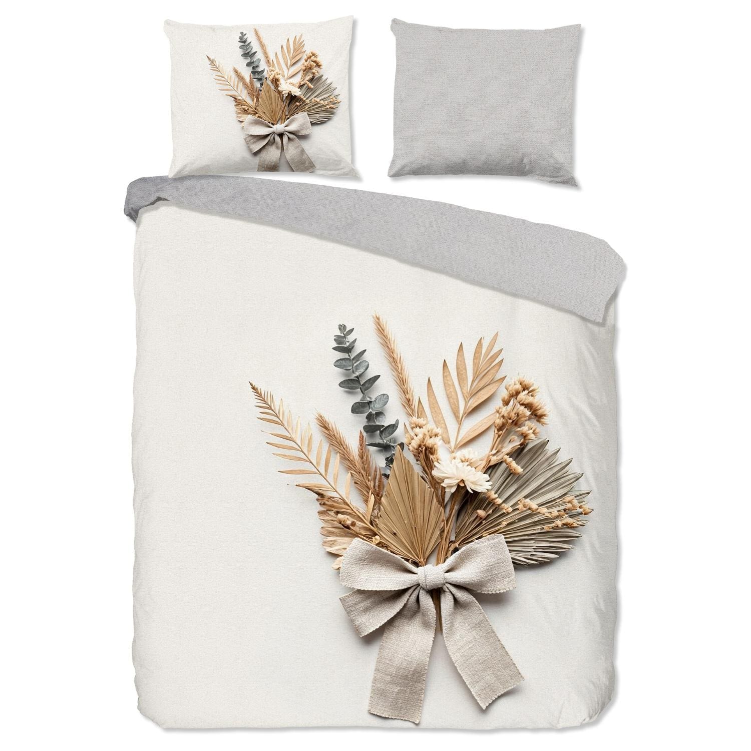 De voorzijde van het overtrek is gedecoreerd met een verfijnde print van een droogboeket, bestaande uit diverse bladeren, grassen en bloemen in warme beige- en zandtinten, samengebonden met een brede linnen-look strik. Deze subtiele en toch decoratieve print geeft je slaapkamer een kalme, natuurlijke uitstraling en past perfect in moderne, landelijke of Scandinavische interieurs. De effen grijze achterzijde biedt een mooi contrast en zorgt ervoor dat je het overtrek ook omgekeerd kunt gebruiken voor een meer minimalistische look.