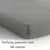 Een hoeslaken 90×200 dat exact past is een must voor elk bed. Dankzij het elastische gevoel rondom laat het Sleeps Jersey Hoeslaken zich moeiteloos om matrassen tot 30 cm dikte leggen. Geen rimpels, geen loslatende hoeken en dus geen onrust tijdens je slaap. Of je nu kiest voor een smal hoeslaken 90×200 of een breed tweepersoonsmodel, de stretch in de stof garandeert altijd die perfecte fit.