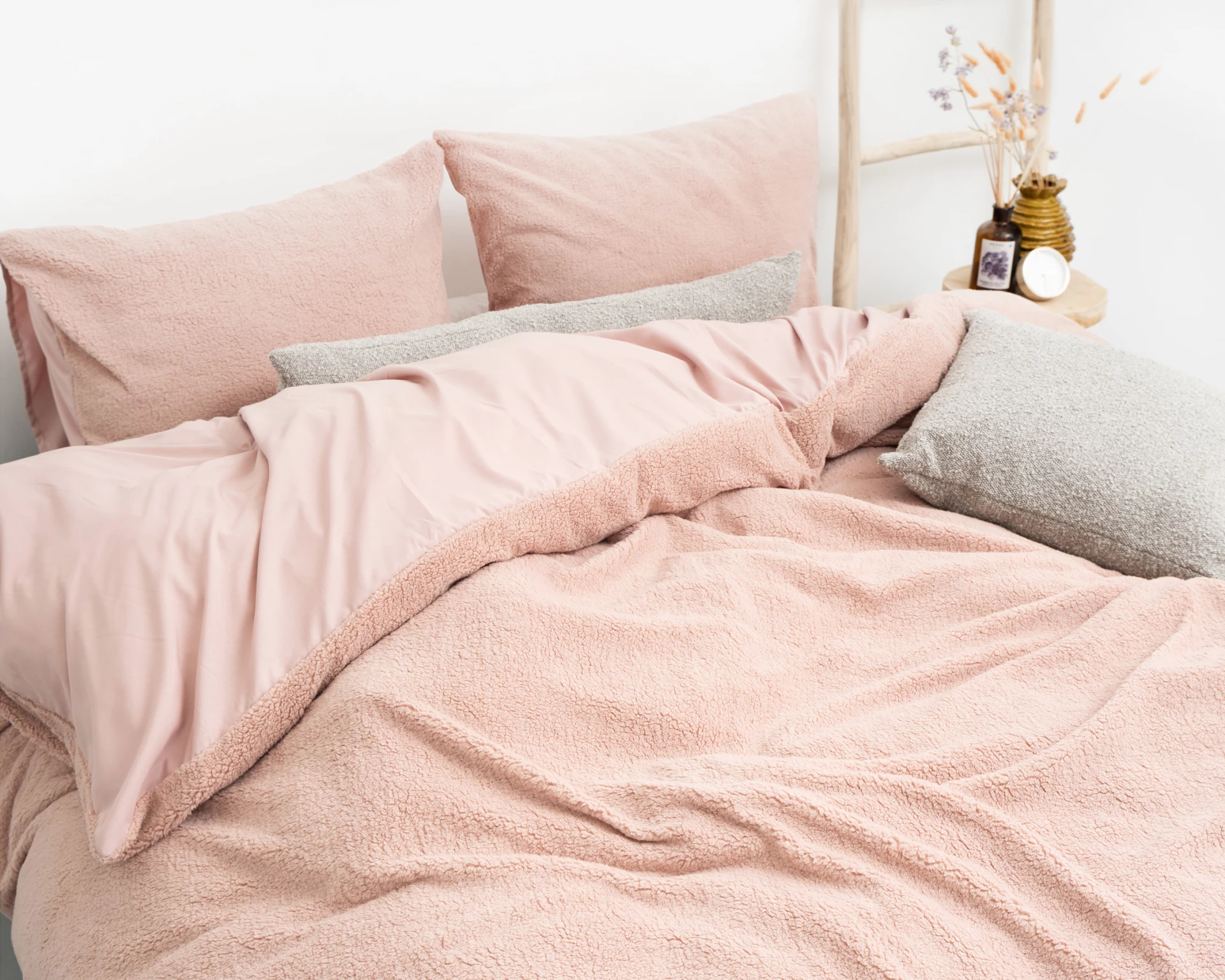 - Voeg bijpassende kussenslopen in teddy stof toe voor een harmonieus geheel.